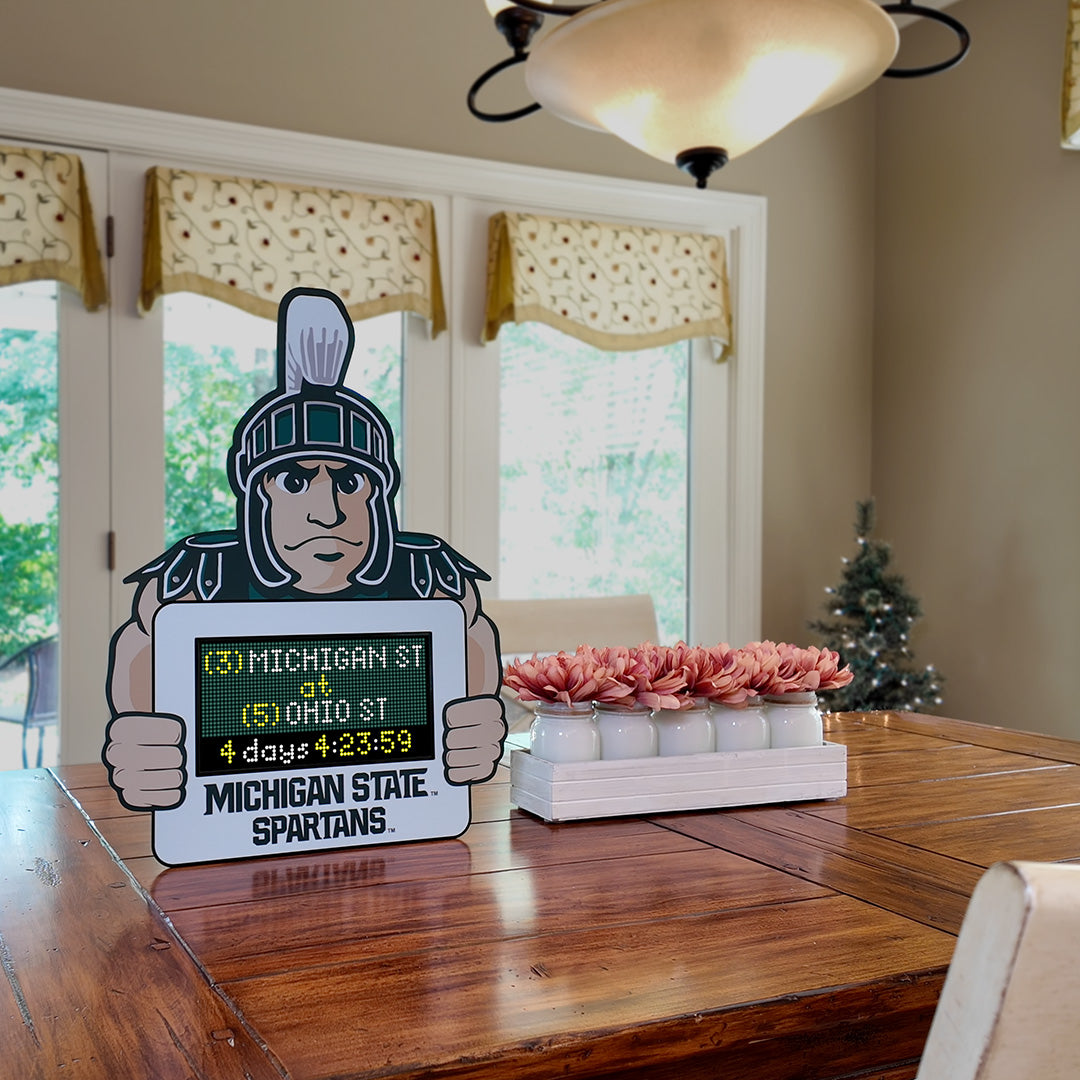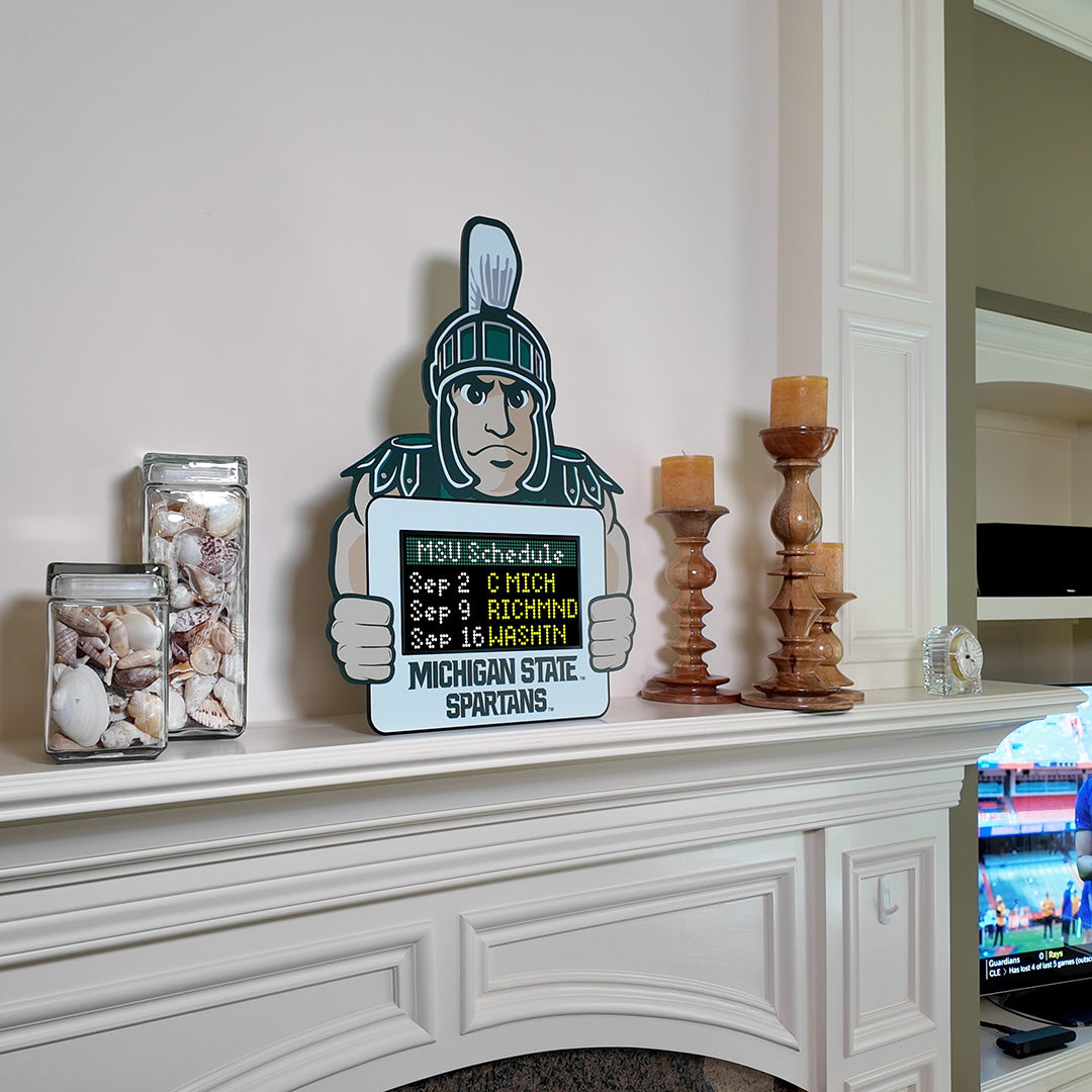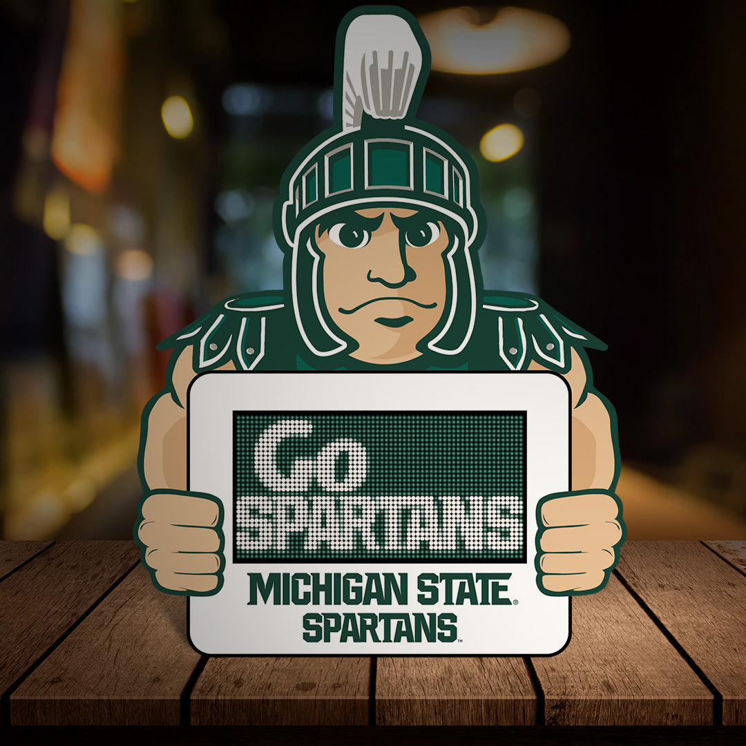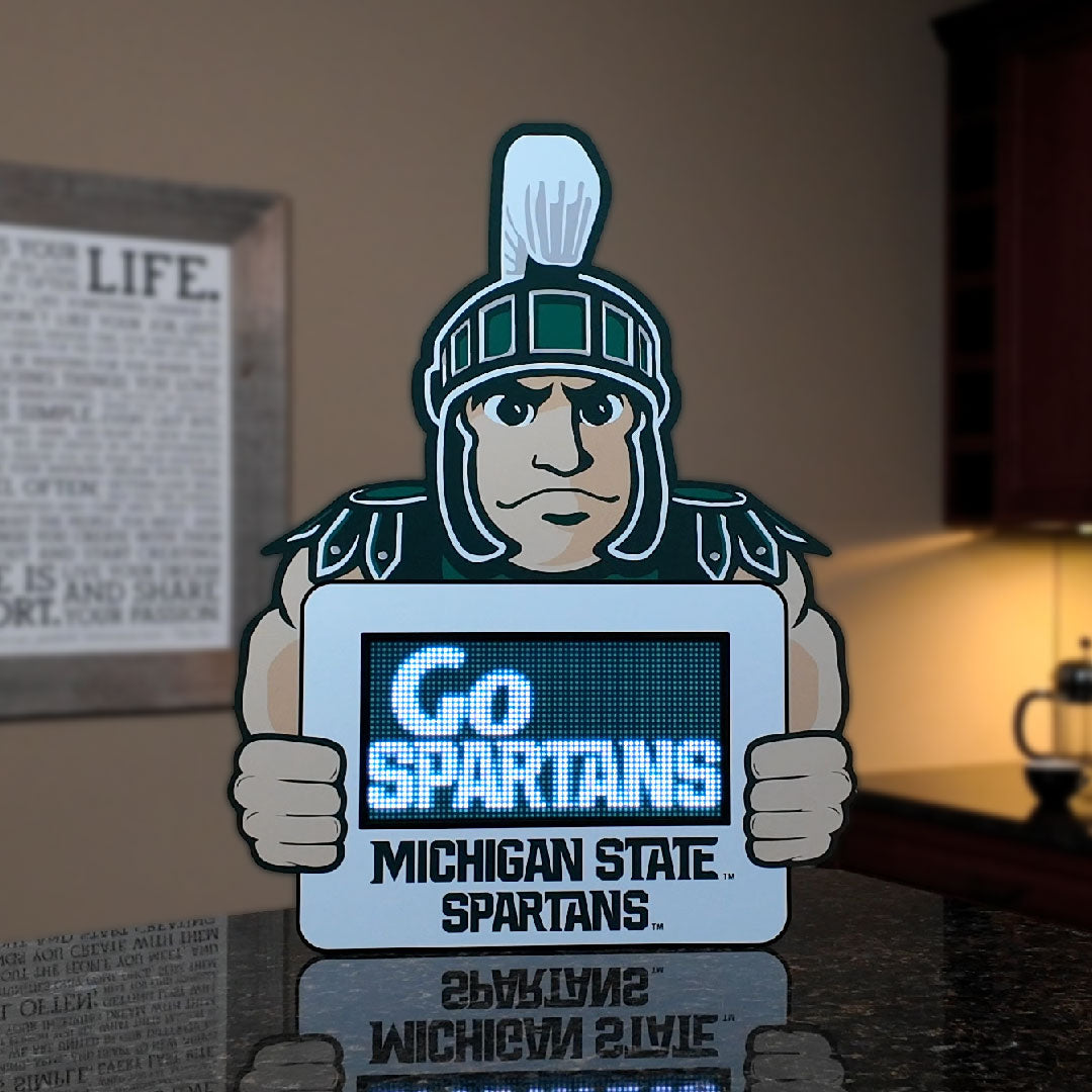 The Michigan State Spartans Sparty TeamTicker is the ultimate addition for anyone wanting to showcase their team pride. Its custom graphics and easy-to-hang design make it the perfect piece to display in your home, fan cave, game room, dorm room or office. The digital LED display provides you with a unique way to stay connected to the latest team and player information. Get one for yourself and one as the perfect gift for that devoted Michigan State Spartans fan.
