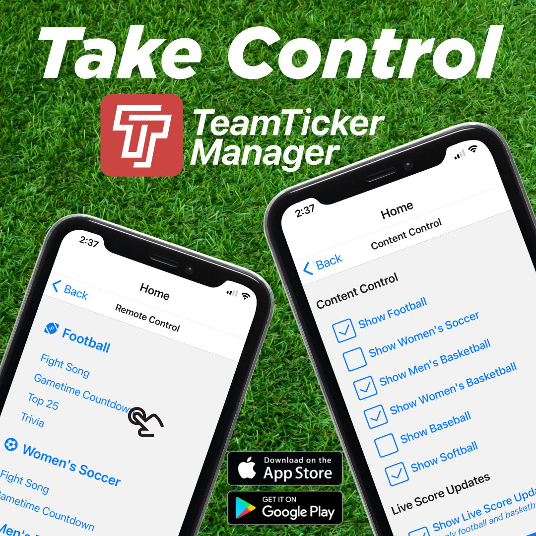 The companion Apple or Android mobile app provides registration, remote control and content control of your TeamTicker sign.